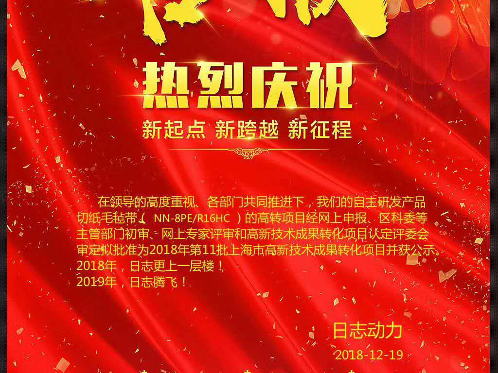 依據《關于進一步促進科技成果轉移轉化的實施意見》(滬府辦發〔2015〕46號)和《上海市高新技術成果轉化項目認定程序》(滬科[2009]第586號)文的要求,經企業網上申報、區科委等主管部門初審、網上專家評審和高新技術成果轉化項目認定評委會審定,以下67個項目通過審核認定,擬批準 日志動力產品——切紙毛氈帶(NN-8PE/R16HC)為2018年第11批上海市高新技術成果轉化項目。